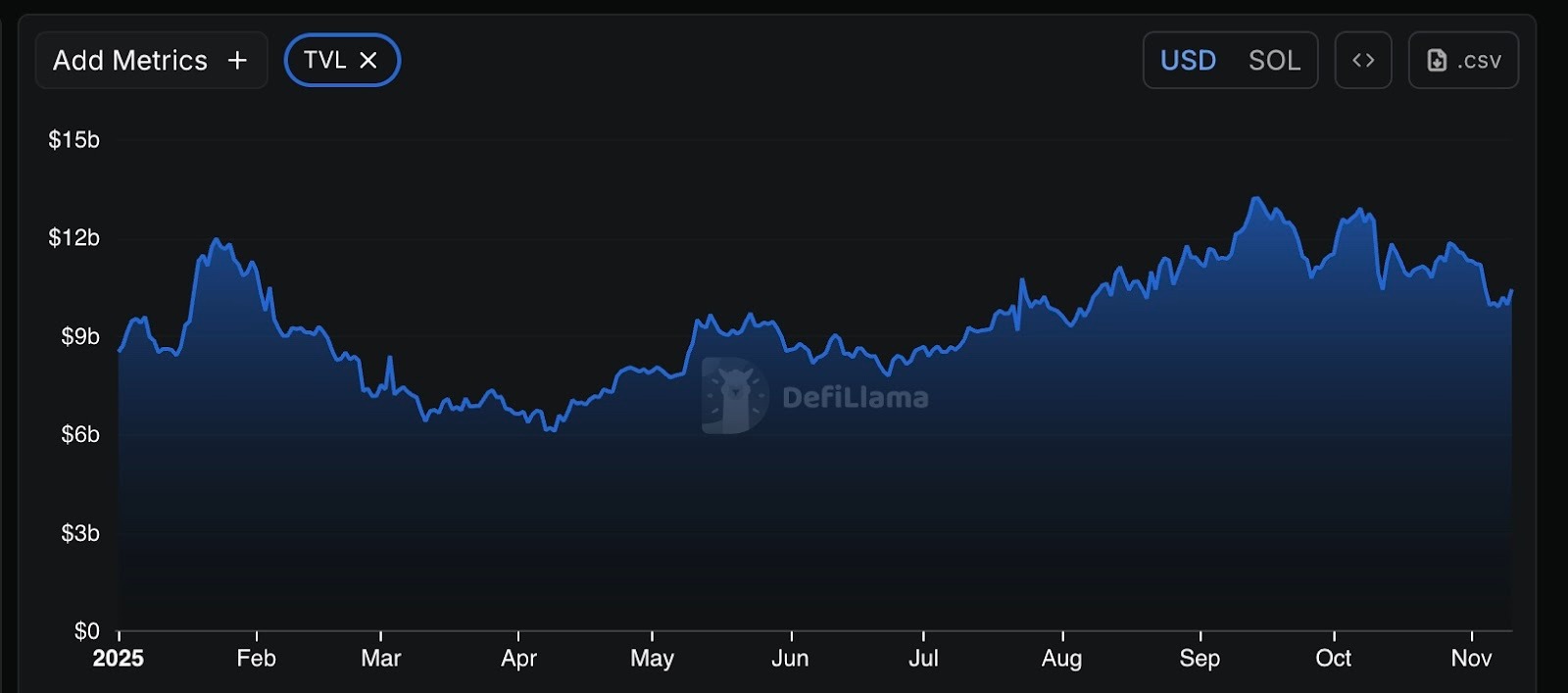 Solana’s DeFi landscape has undergone a visible expansion throughout 2025, with total value locked (TVL) rising from $8.53 billion in January to ~$10.4 billion by November. The expansion we’ve seen over the course of the year has been largely propelled by the leading protocols.