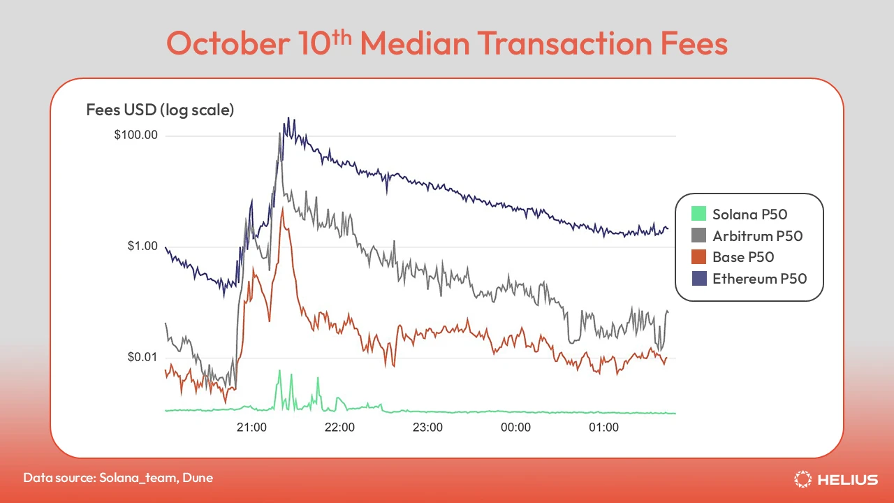While Solana performed smoothly, several Ethereum L2s, including Arbitrum, reported latency issues, and major centralized exchanges like Binance temporarily halted trading as liquidity dried up. Although only briefly, Ethereum and Arbitrum’s medium fees spiked to $100 per transaction during the same period. Coinbase’s Base L2 median fees rose to over $3 at one point.